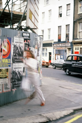 The dynamism of the city undergoing endless transformations suggested a project for two bodies in movement. Two artists ran around the perimeter of a building site, one city block, approximately 300 metres in opposite directions crossing each other at different points. An ancient rite in a technological environment, a photograpic document of a site in the city of London which will disappear and become something else. [NP/LR, 1978]